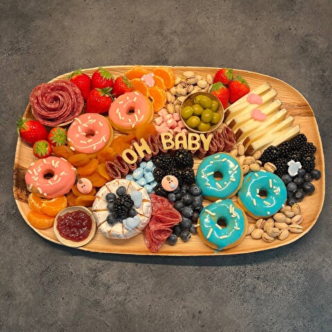 Omdat het geslacht van de baby nog onbekend was, was het thema duidelijk: we gingen voor een combinatie van roze en blauw. Hierdoor werd het borrelplankje natuurlijk ontzettend kleurrijk!